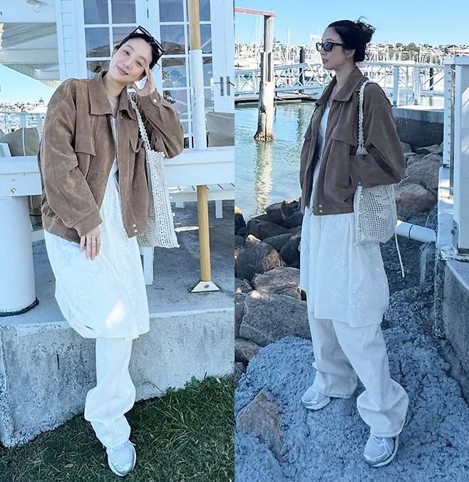 공개한 사진에서 정려원은 화이트 원피스에 루즈한 팬츠를 레이어드하고 브라운 스웨이드 재킷을 걸친 보헤미안룩으로 빈티지하면서도 내추럴한 분위기를 선보였다.