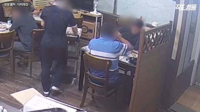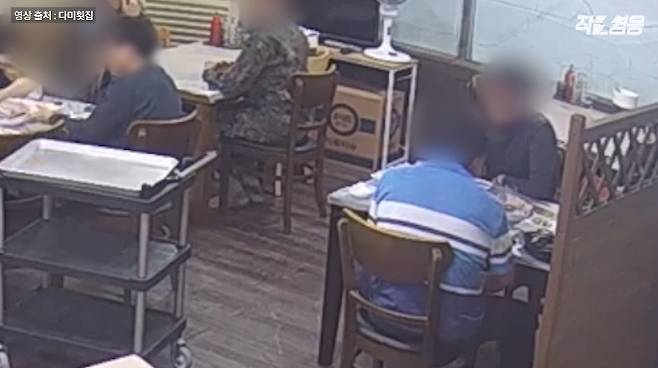군인들의 먹는 모습을 힐끔힐끔 쳐다보는 여기 이 아저씨들. 한 아저씨는 의자에 팔을 기대는 척 슬며시 군인들 쪽으로 몸을 틀더니 뭐가 그리 좋은지 환하게 웃으며 술잔을 기울입니다. 얼마 후 매운탕까지 다 먹고 자리에서 일어난 아저씨들은 계산대로 향합니다.