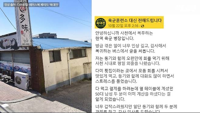 지난 10월 22일 저녁 경남 사천에 있는 한 횟집. 금요일 저녁답게 가게 안은 손님들로 북적였죠. 그때 군복 차림의 청년 두 명이 가게 안으로 들어와 주문을 합니다.