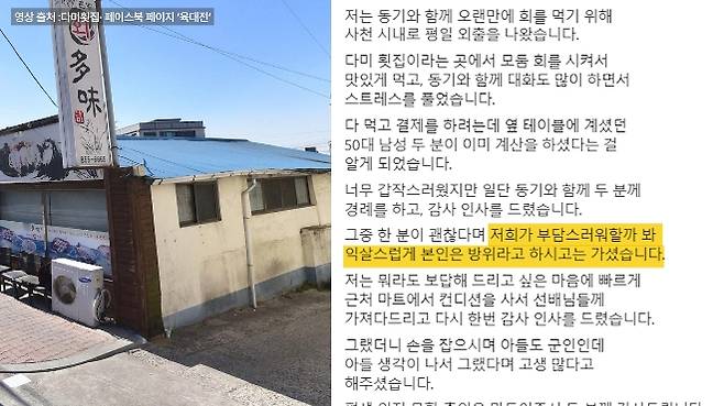 이틀 뒤 영상 속 군인은 페이스북 페이지 ‘육대전’에 그날의 훈훈한 경험담을 전하며 “저희가 부담스러워할까 봐 익살스럽게 본인은 ‘방위’라고 하고 가셨다”며 “아들도 군인인데 아들 생각나서 그랬다. 고생 많다고 해주셨다”고 썼습니다. 그러면서 “저도 나중에 꼭 옆 테이블에 군인이 있다면 아무렇지 않게 대신 계산해 주는 어른이 되겠다”고 다짐했죠.