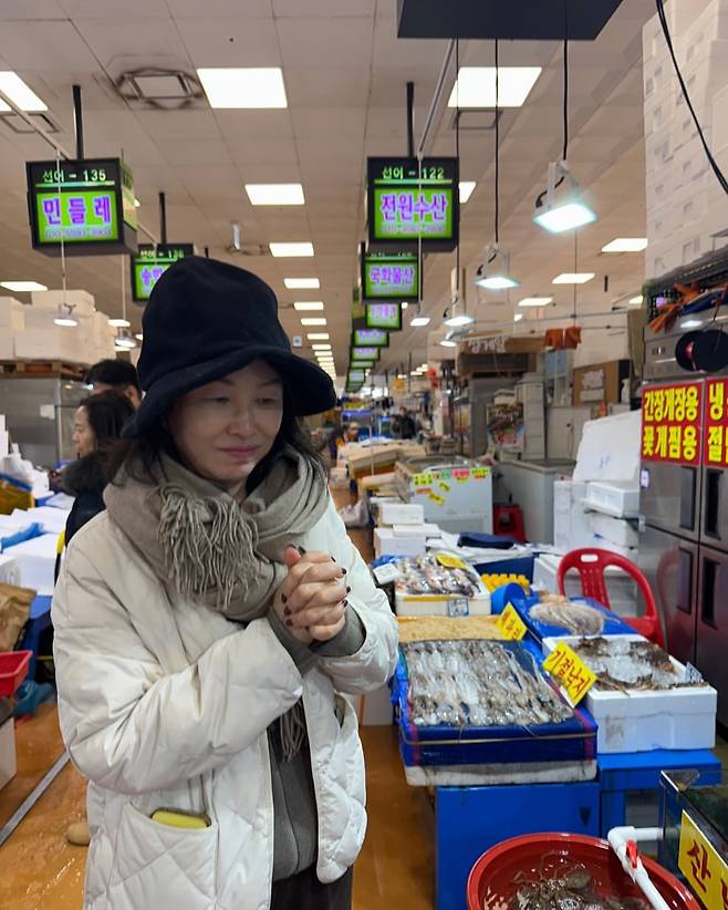 김미숙은 전통시장 방문에서 따뜻하고 실용적인 캐주얼룩을 연출했다. 퀼팅된 아이보리 패딩과 베이지 스카프는 보온성을 강조하며, 블랙 버킷햇은 스타일리시한 포인트를 더했다. 손에 깍지 낀 포즈는 편안한 분위기를 자아내며, 전통시장의 활기찬 배경과 조화를 이룬다.
