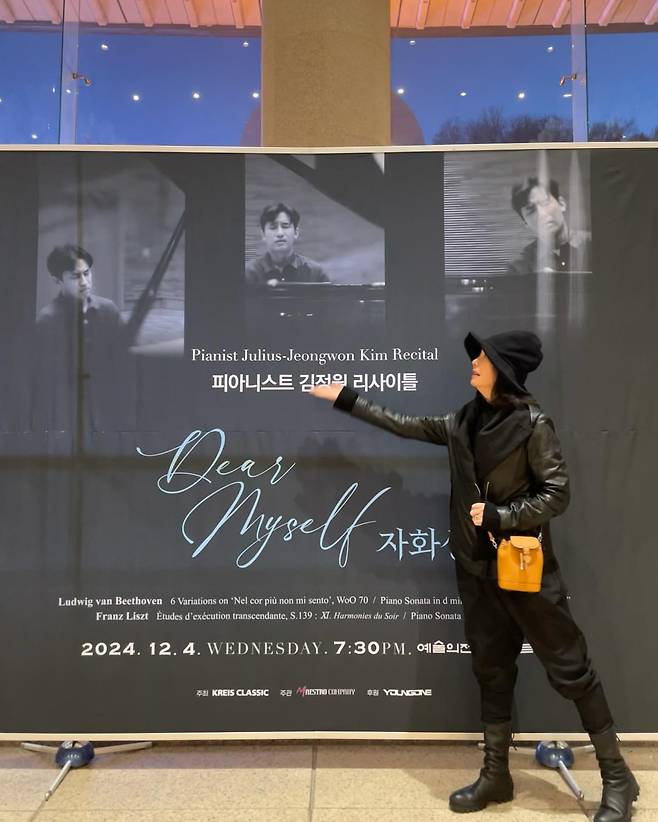 리사이틀 포스터 앞에서 김미숙은 세련된 올블랙룩을 선보였다. 블랙 가죽 재킷과 팬츠는 강렬하면서도 모던한 이미지를 연출하며, 여기에 블랙 버킷햇과 브라운 미니 크로스백을 매치해 컬러 밸런스를 완성했다. 전체적으로 시크하면서도 실용적인 스타일링이 돋보인다.