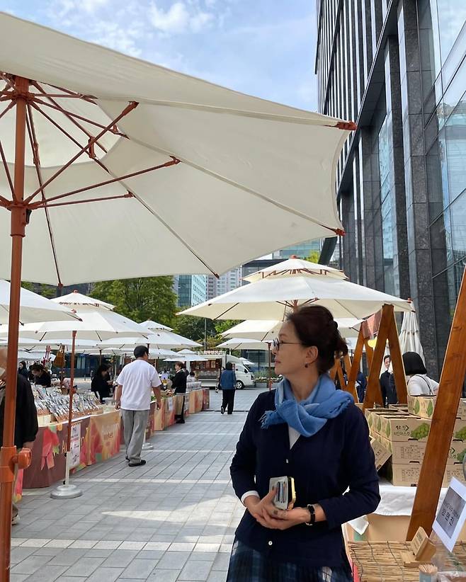 야외 마켓에서는 네이비 카디건과 체크 스커트로 우아한 분위기를 연출했다. 하늘색 스카프는 부드러운 컬러 포인트를 더하며, 차분하고 고급스러운 느낌을 강조한다. 깔끔하게 묶은 헤어스타일과 자연스러운 포즈가 그녀의 세련된 이미지를 배가시킨다.