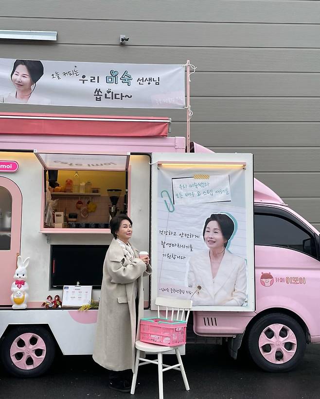 커피차 앞에서 김미숙은 클래식한 베이지 코트를 입고 단아한 매력을 선보였다. 루즈핏 코트는 여유로운 실루엣을 강조하며, 깔끔하게 정돈된 헤어와 자연스러운 메이크업이 조화를 이룬다. 핑크와 화이트로 꾸며진 커피차와 어우러져 따뜻하고 친근한 분위기를 자아낸다.