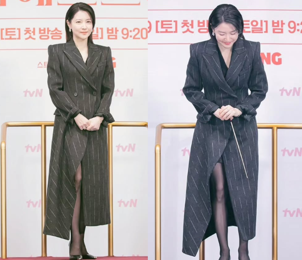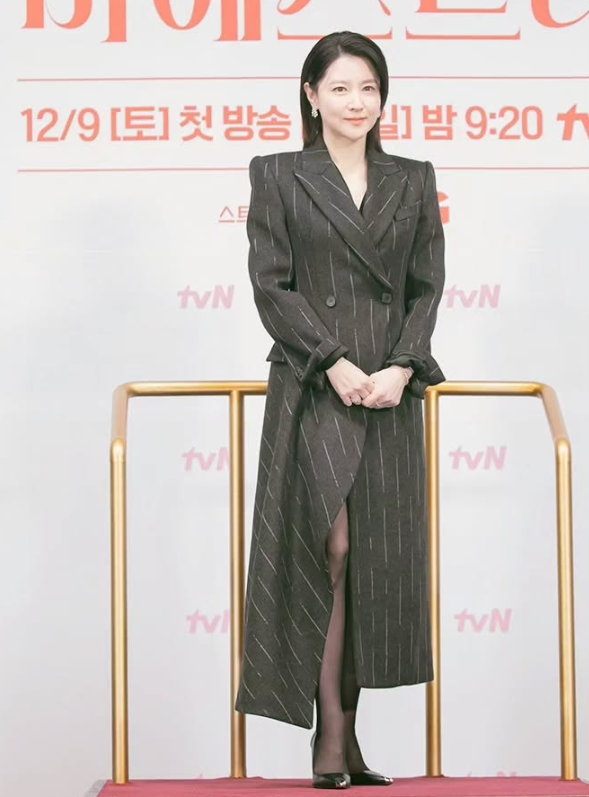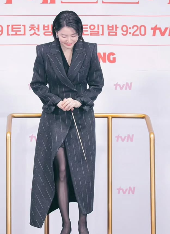 이영애의 원피스 형태의 롱자켓은 스트라이프 패턴과 클래식한 디자인이 돋보여 그녀의 고급스러운 이미지를 강조했습니다. 어깨는 직각으로 떨어져 세련된 느낌을 주며, 허리는 핏되게 잡아 그녀의 체형을 완벽하게 살린 스타일링이었습니다.