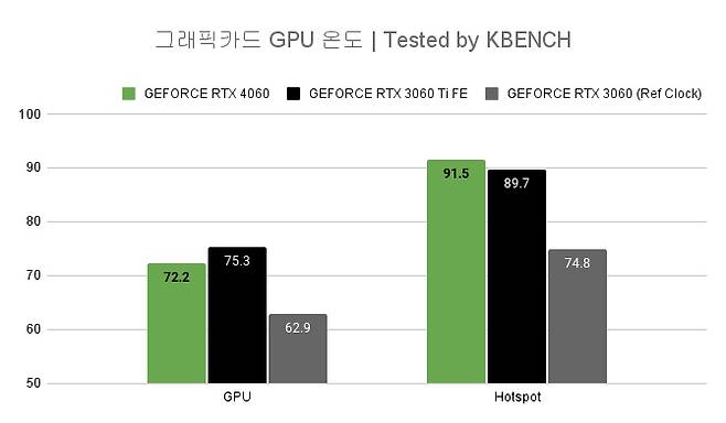 필자가 테스트 한 지포스 RTX 4060도 그런 제품였지만 아쉽게도 핫 스팟 온도는 그렇지 못했다. (3DMARK 타임스파이 익스트림 스트레스 테스트)