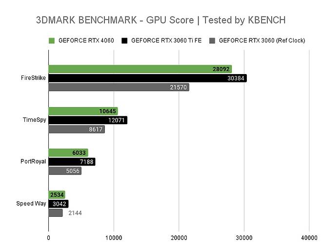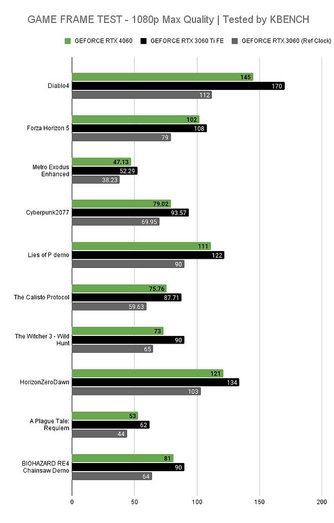 테스트는 레퍼런스 클럭에 맞춰 진행 됐다. 시스템은 AMD 라이젠 7 7700X와 DDR5 6000 메모리를 조합해 사용하였으며 드라이버는 지포스 RTX 4060를 제외한 나머지 버전만 현재 공개된 가장 최신 버전을 사용했다. 지포스 RTX 4060은 엔비디아가 제공한 536.20 버전이 사용됐다.