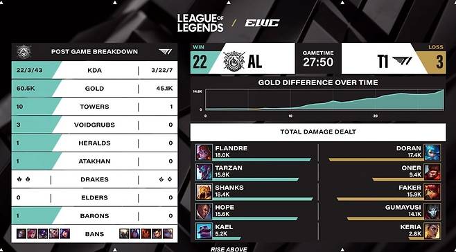바론까지 무난히 가져간 AL은 바론 버프와 함께 미드로 돌진해 T1의 챔피언을 모두 잡아내고 경기 시간 27분 만에 T1의 넥서스를 파괴하고 먼저 1승을 달성했다.
