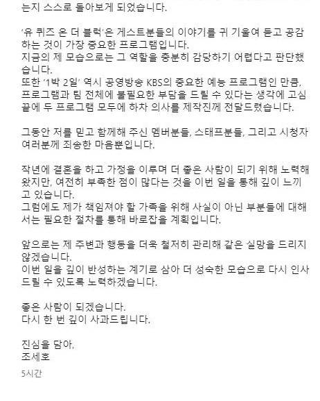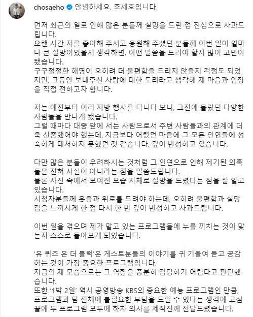 조세호가 tvN ‘유퀴즈 온 더 블럭’과 KBS2 ‘1박 2일’에서 자진 하차합니다. 소속사는 최근 불거진 오해와 구설에 대해 깊은 책임감을 느끼고 있으며, 시청자와 제작진에게 부담을 주지 않기 위해 논의 끝에 하차를 결정했다고 밝혔습니다.