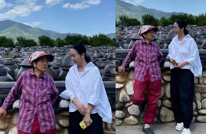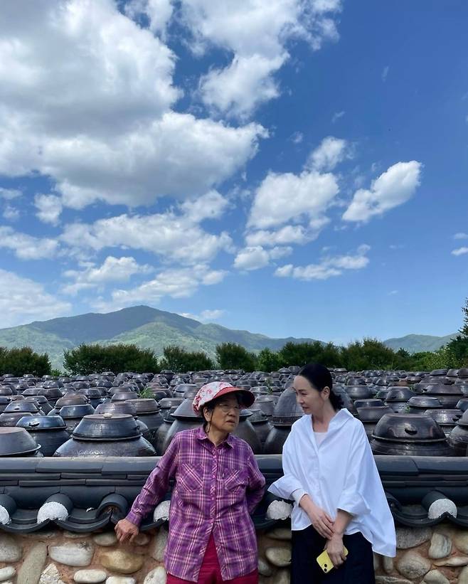 배우 김미숙이 14일 인스타그램에 "근처에서 촬영중에…오랜만에 뵙고 온 홍쌍리선생님…^^(어쩔수없이 쪽진머리…^^;)"라는 글과 함께 여러 장의 사진을 게재했습니다.