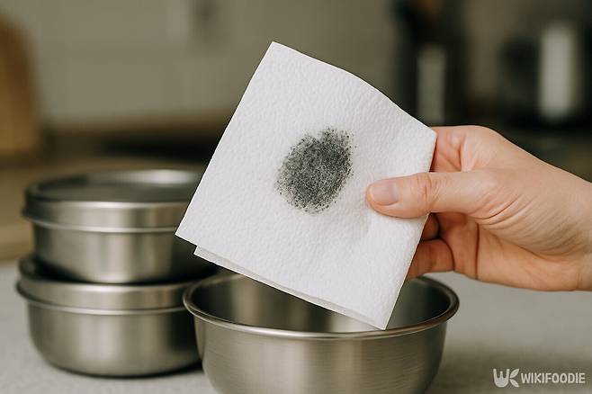 스테인리스 제품은 제조 과정에서 ‘연마제’를 사용해 표면을 매끄럽게 처리하는데, 이 연마제가 제품 표면에 남아 있을 수 있다. 겉보기엔 아무 이상 없어 보여도, 기름을 묻힌 종이타월로 문질렀을 때 까만 가루가 묻어나오는 경우가 많다.