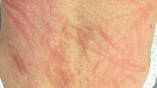 온몸이 가려워 긁으면 부풀어 오르면서 줄로 그은 듯한 자국이 생기는 게 특징이고,