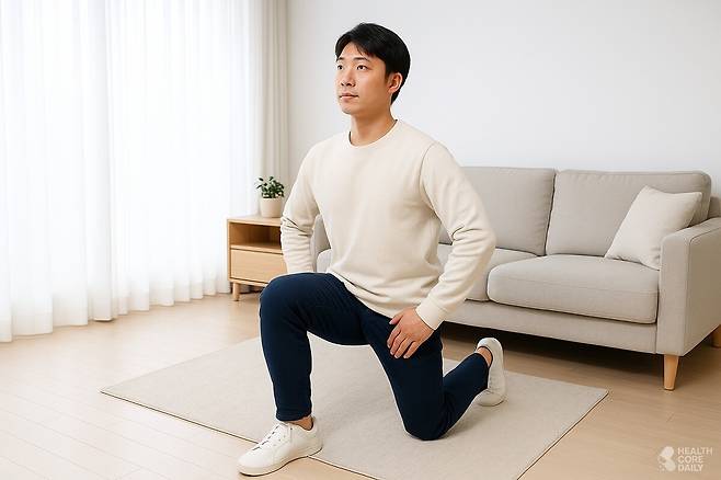 런지: 한쪽 다리를 앞으로 내딛고, 뒤쪽 무릎이 바닥에 거의 닿을 정도로 낮춘다. 이때 상체를 곧게 유지하고, 앞 무릎이 발끝을 넘지 않게 주의한다. 양쪽 다리 번갈아 10~20회씩 3세트.