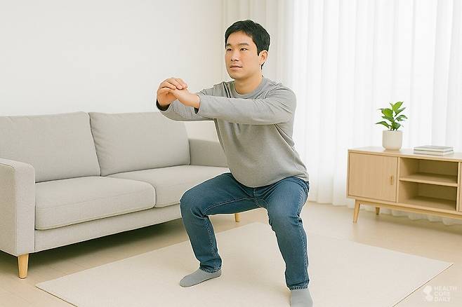 스쿼트: 다리를 어깨너비보다 조금 넓게 벌리고 발끝을 약간 바깥쪽으로 향하게 선다. 허리를 곧게 세운 채 엉덩이를 뒤로 빼며 무릎을 굽혔다가, 발바닥으로 바닥을 밀어내며 일어선다. 15회씩 3세트.