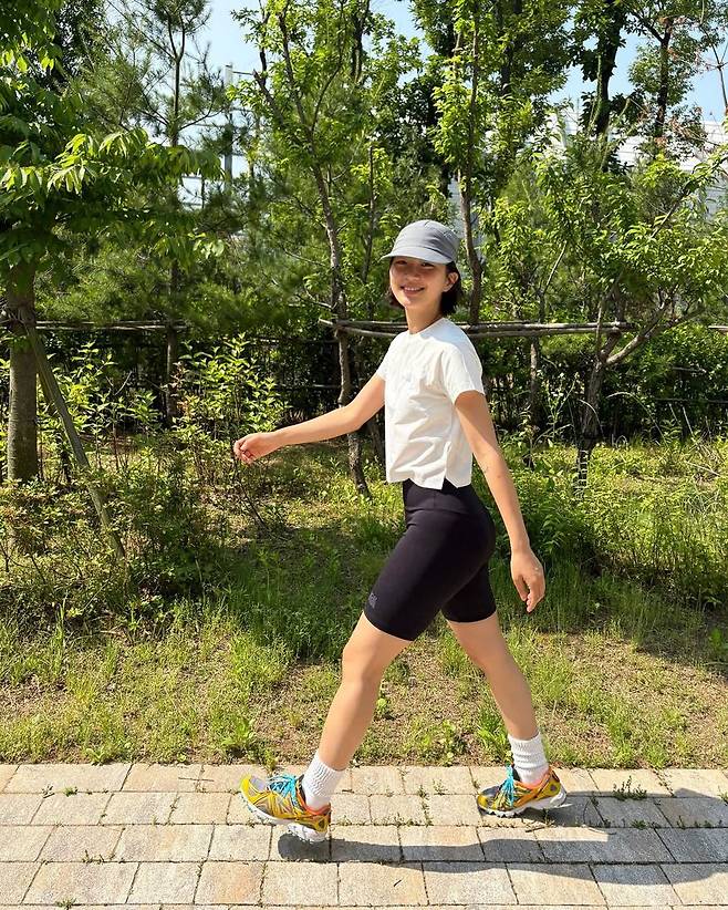 박승희는 화이트 반팔 티셔츠와 블랙 바이커 쇼츠를 매치해 여름철 러닝에 최적화된 심플하면서도 실용적인 코디를 완성했다. 바디라인을 따라 밀착되는 쇼츠는 활동성을 높이면서도 군살 없는 실루엣을 강조했고, 여기에 두툼한 화이트 양말과 옐로 컬러 포인트의 러닝화를 매치해 경쾌한 에너지를 더했다. 그레이 톤의 선캡은 자외선 차단은 물론, 스타일링의 완성도를 높이는 아이템으로 작용했다.