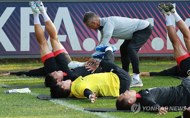 (파주=연합뉴스) 한종찬 기자 = 손흥민과 김승규가 9일 오후 파주NFC(축구대표팀 트레이닝센터)에서 열린 한국 축구대표팀 소집훈련에서 스트레칭을 하고 있다. 국제축구연맹(FIFA) 랭킹 26위인 축구대표팀은 13일 오후 8시 서울월드컵경기장에서 튀니지(29위), 17일 오후 8시 수원월드컵경기장에서 베트남(95위)과 잇달아 맞붙는다. 2023.10.9