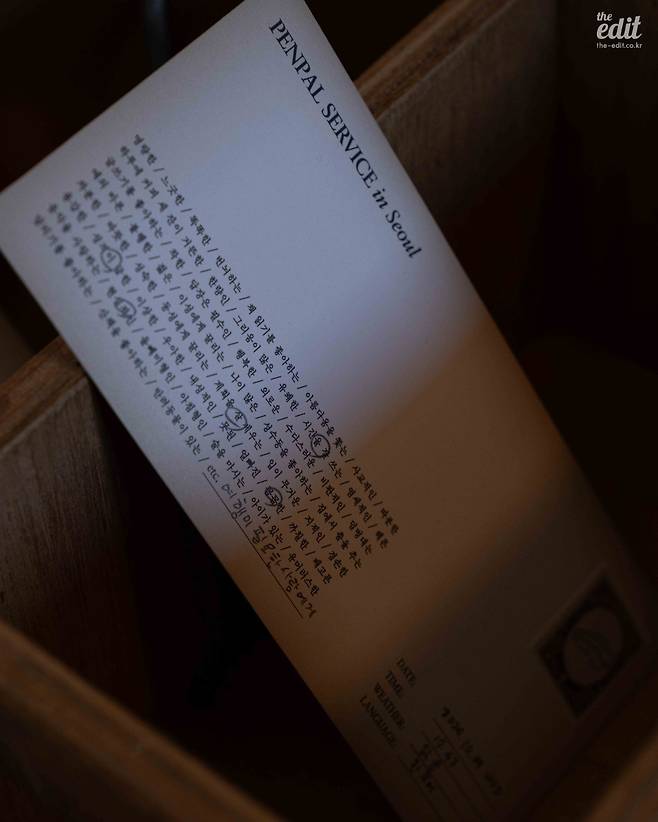 글월에서는 ‘펜팔 서비스’도 운영한다. 누가 읽을지 모르는 편지를 쓰고 누가 보낸지 모르는 편지를 받는 서비스다. 1만 원을 내면 편지지, 봉투, 스티커, 필기구를 제공하고, 편지를 써서 카운터에 접수하면 다른 이의 편지 한 통을 가져갈 수 있다. 누가 어떤 내용을 썼는지는 비밀이지만, 봉투에 쓰인 몇 가지 키워드로 힌트는 얻을 수 있다. 명랑한, 아름다움을 쫓는, 이상한, 하루에 커피 세 잔이 거뜬한, 집에서 춤을 추는… 물론 본인이 쓴 편지에도 키워드를 체크할 수 있다. 수신자를 모르는 편지라면 원 없이 솔직해질 수 있을 것 같다.