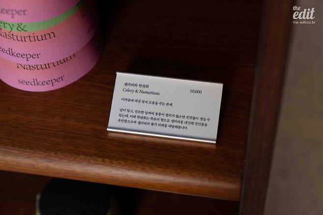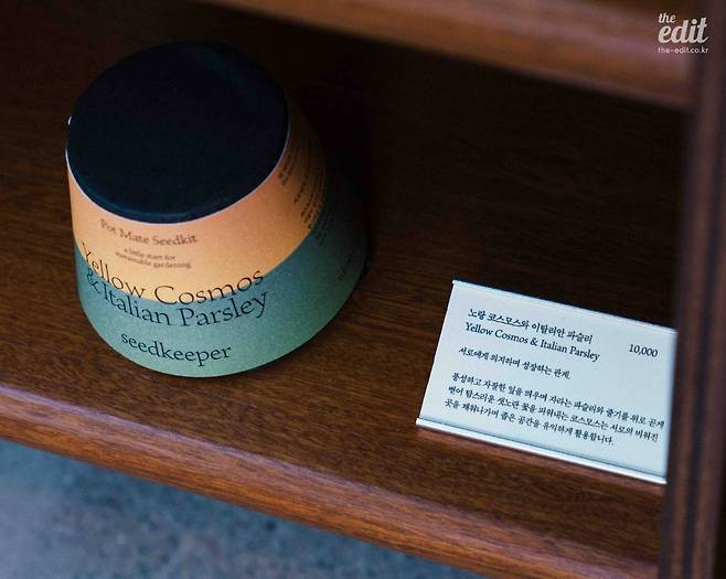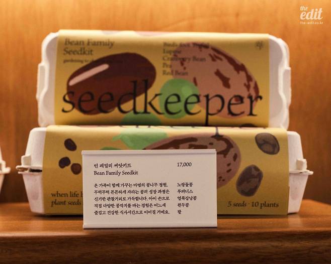 씨드키퍼는 씨앗과 삶을 연결 짓는다. 이곳에서는 판매하는 씨앗을 이런 식으로 설명한다. ‘인생을 건강하게 살찌우는’, ‘잎을 우려내는 순간까지 나를 쉬게 하는’, ‘즐겁고 건강한 식사시간으로 이어질’, ‘온 가족이 함께 가꾸는’. 지금 자신에게 필요한 문장을 찾아 씨앗을 골라봐도 좋겠다.