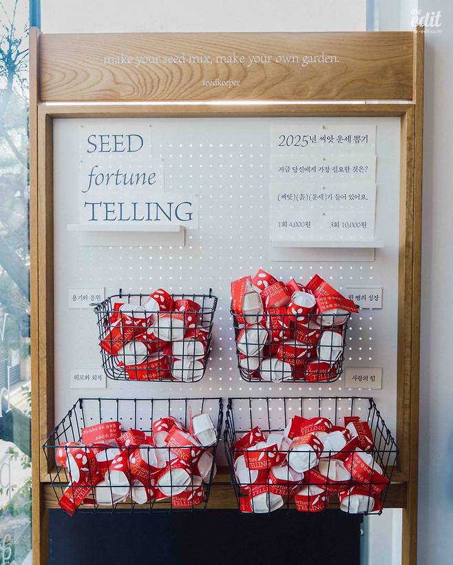 새해를 앞두고 2025년의 운세를 씨앗 뽑기로 점쳐볼 수도 있다. 용기와 응원, 위로와 회복, 한 뼘의 성장, 사랑의 힘 중 지금 나에게 가장 필요한 키워드의 씨앗을 뽑으면 된다. 내가 고른 키워드와 어울리는 씨앗과 흙, 그리고 운세 풀이가 들어있다.