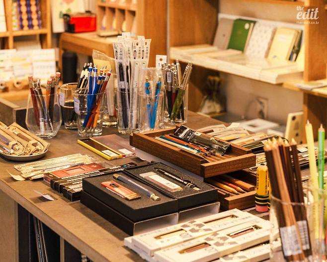 가운데 탁자에는 필기구가 모여있다. 하루, 한 주, 한 달의 기록을 엮어나갈 수 있는 공장의 추천 제품이다. 때때로 샘플이나 약간의 하자가 있는 상품, 시기가 지난 다이어리 등을 무료로 나누거나 아주 저렴하게 판매하기도 한다.