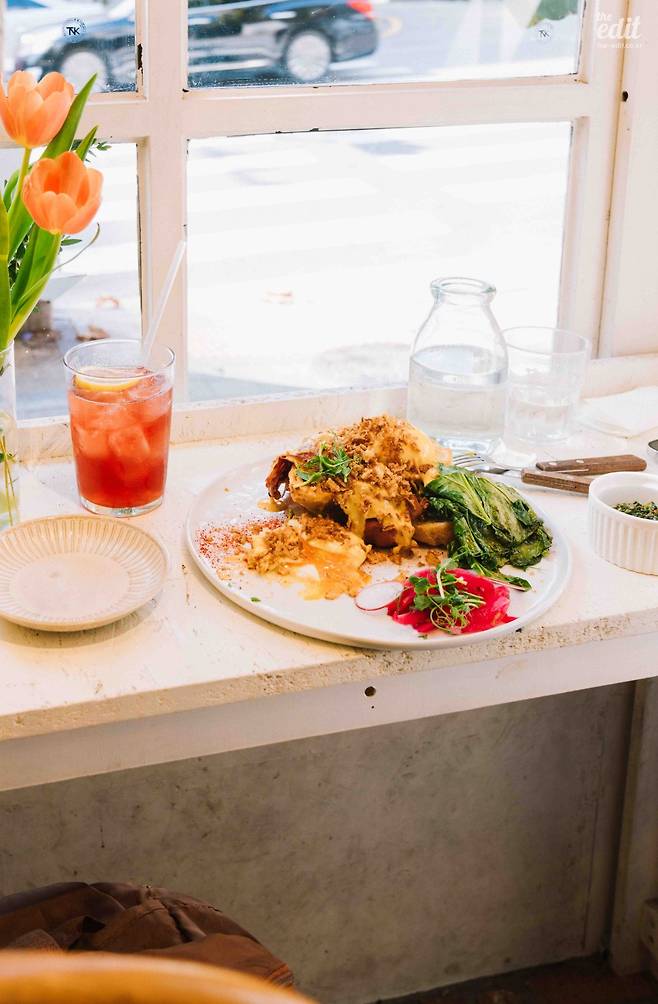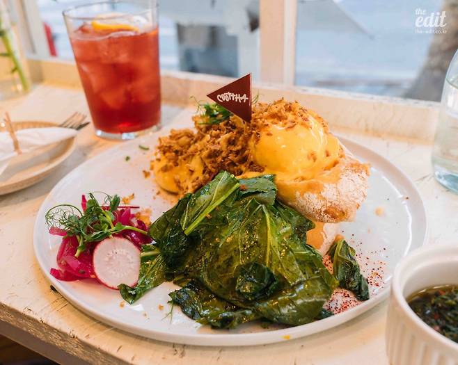 따사로운 햇살이 비추는 브런치 맛집. 혼자 온 손님은 이렇게 창가 자리에 앉을 수 있는 행운이 주어진다. 추천 메뉴는 쿳사의 대표 메뉴인 에그 베네딕트. 직접 만든 쫀득한 치아바타에 수란이 두 개나 올라가고, 식감을 책임질 바삭한 양파 플레이크와 바짝 구운 베이컨, 홀랜다이즈 소스가 곁들여진다. 쿳사만의 킥이 있다면 그릇 바닥에 발린 파프리카 파우더. 살짝 매콤한 맛을 더해줘서 끝까지 물리지 않고 먹을 수 있다. 구운 시금치와 상큼한 적양파 피클도 사이드로 나온다.