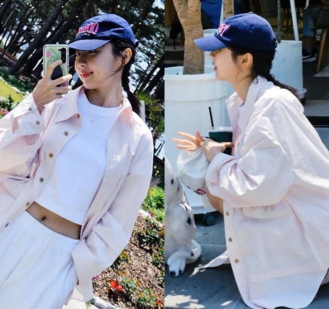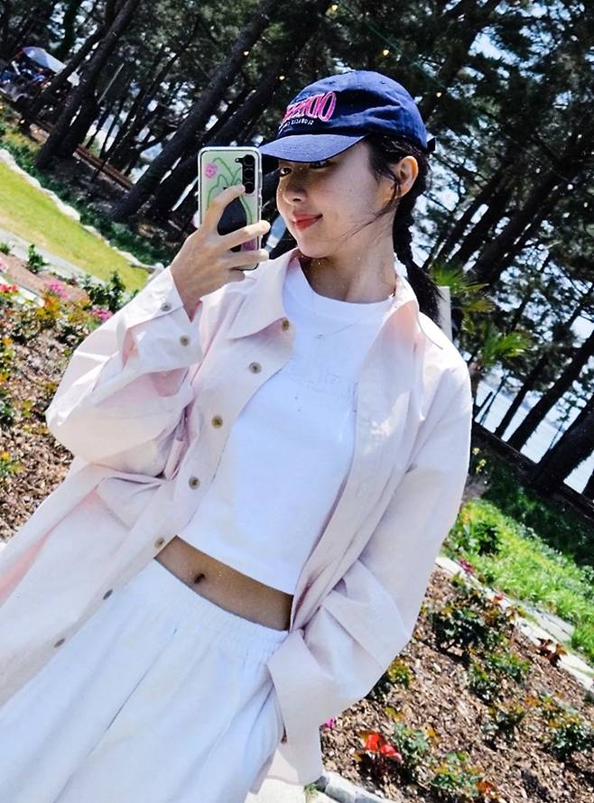 공개한 사진에서 주현영은 예쁘게 닿은 머리에 볼캡을 쓰고 배가 드러난 화이트크롭 티셔츠와 화이트 팬츠에 오버핏 셔츠를 걸친 꾸민듯 안꾸민 스타일의 나들이룩을 완성했다.