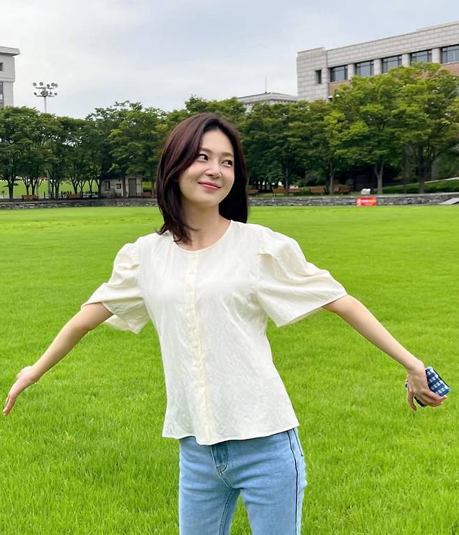잔디밭 위에서 팔을 뻗고 환하게 웃는 모습, 카메라를 향해 꽃받침 포즈를 짓는 순간은 소녀 같은 맑은 분위기를 자아냈습니다.