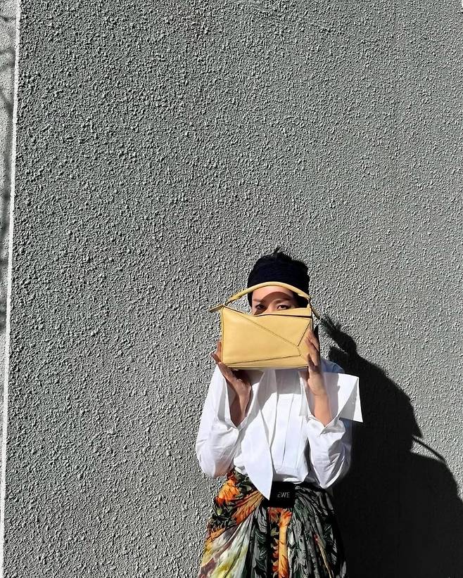 머리에는 블랙 헤어밴드로 포인트를 주며 얼굴을 또렷하게 살렸고, 옐로 컬러의 기하학적 구조 백으로 산뜻한 컬러감을 더해 전체 룩에 생기를 불어넣었습니다.