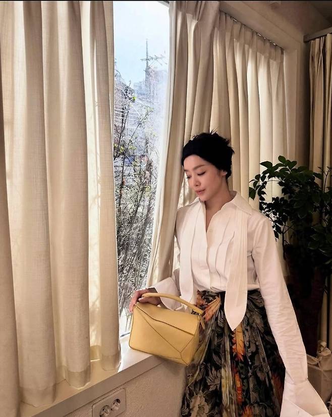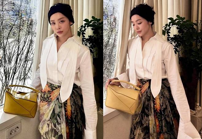 입체적인 핀턱 디테일이 더해진 화이트 셔츠는 넓은 소매와 자연스러운 핏으로 클래식하면서도 드라마틱한 실루엣을 자아냈고, 여기에 고전 회화 속 풍경을 연상케 하는 빈티지 플라워 패턴의 롱스커트를 더해 한층 독특한 분위기를 연출했습니다.