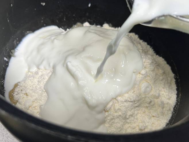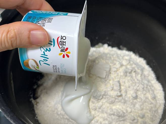여기에 핫케이크 가루 200g과 요거트 95g짜리 1.5개를 넣으세요. 요거트는 플레인 요거트를 쓰시면 됩니다.