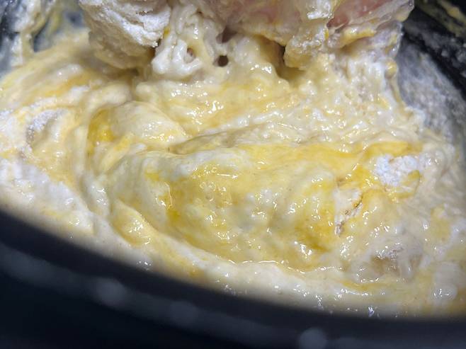 손이나 주걱 등을 이용해서 재료들을 잘 섞어 주세요. 특히 계란과 팬케이크 가루가 잘 섞이도록 치대서 반죽을 만들어 주세요.