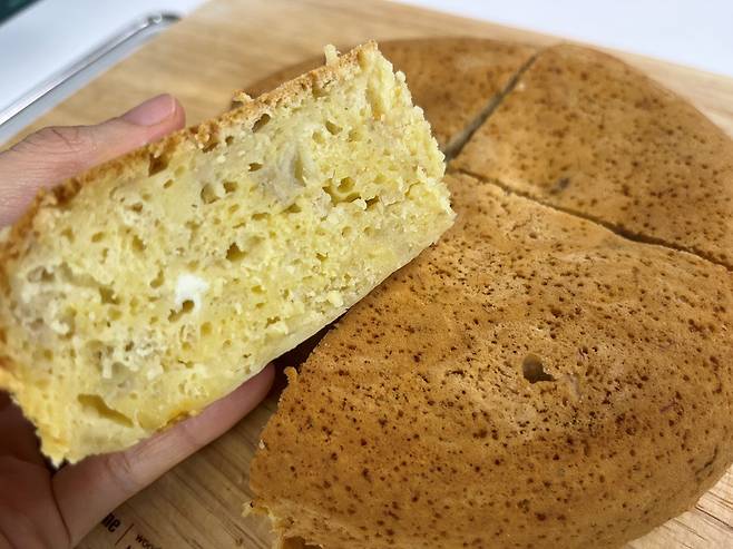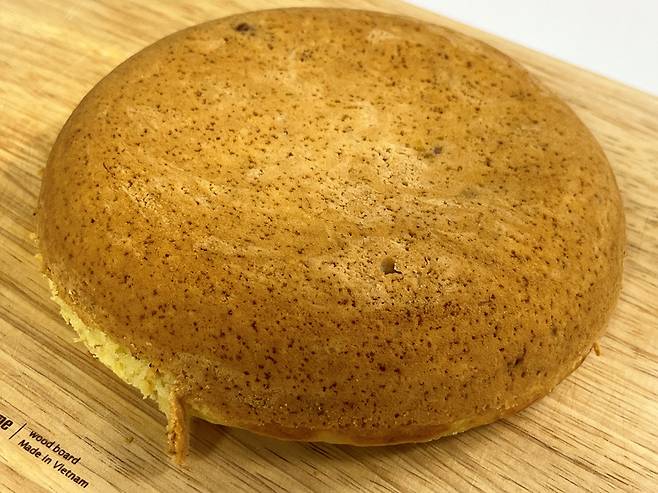 밥솥으로 만드는 거라 별 기대를 안 했는데 생각보다 근사한 빵이 되었어요. 어떻게 보면 케이크 시트지처럼 생기기도 했네요.