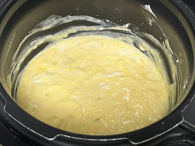 각 재료를 열심히 섞었더니 반죽이 이렇게 완성됐습니다. 이제 밥솥의 영양찜 또는 만능찜 기능으로 40분을 조리합니다.