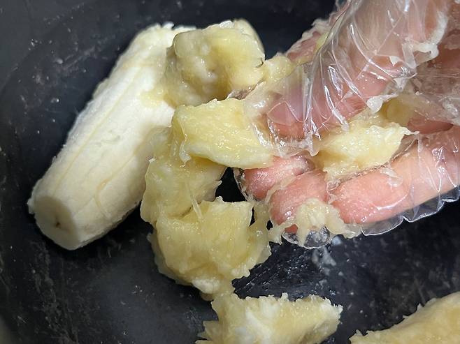 바나나는 손으로 으깨서 최대한 입자를 곱게 만들어 주세요. 바나나 덩어리가 지지 않도록 최대한 부드럽게 으깨세요.