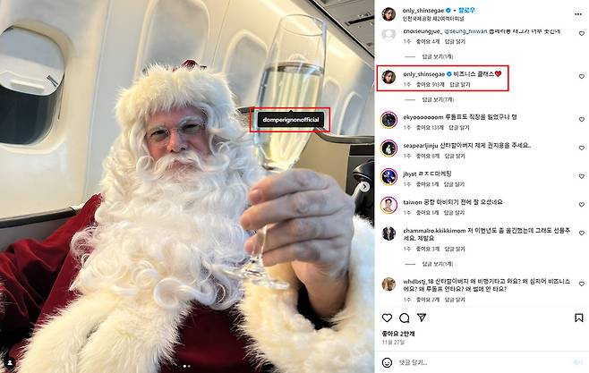 산타는 6451마일을 비행해 인천국제공항에 도착했다고 알렸어요. 비즈니스 클래스를 탑승했고, 돔페리뇽 샴페인을 우아하게 즐기는 것으로 보아 돈이 좀 있는 것 같아요. 비행기를 탄 산타를 보고 다들 ‘루돌프는 어딨냐’며 의문을 가지는 모양새죠. 위치가 제2여객터미널인 걸로 보아 대한항공, 진에어, 에어프랑스 등 총 8개 항공사 중 하나로 입국한 것 같아요.