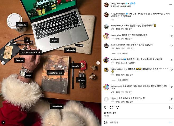 이어서 압구정 스타벅스 리저브매장에 방문해 커피(디카페인)를 마시죠. 노벨문학상을 수상해 구하기 어렵다는 한강 작가의 책 ‘채식주의자(심지어 초판)’를 읽고, 맥북, 포르쉐 차키 그리고 각종 명품들을 태그하면서 재력을 뽐내는 모습이에요. 하나하나 정보를 제공하는 게 하루 이틀 인스타를 해본 솜씨가 아니죠. 한국인의 소울푸드 순대국밥이 마음에 안 들었던 이유도 평소 값 비싼 음식만 먹어서 아닐까요?