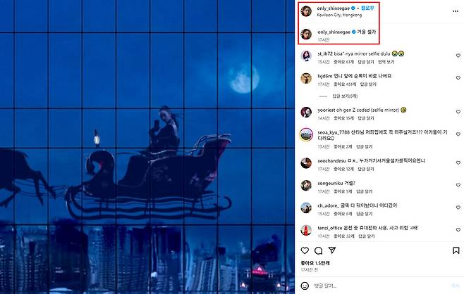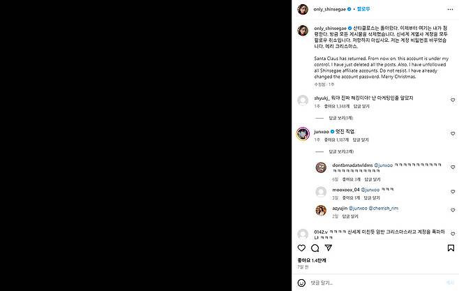 New Santa 카리나는 산타의 폰을 갖고 있고, 크리스마스 선물 배달은 문제 없이 책임지겠다며 세계관에 스며드는 모습인데요. 카리나의 본 계정으로도 배달을 기가맥히게 한다(카리나의 ‘그거 아세요’ 커버를 들으시면 더 재밌습니다)는 댓글을 달고 안심시키죠. 대부분의 반응은 카리나가 새로운 산타가 된 것에 대해 환영하는 분위기예요.