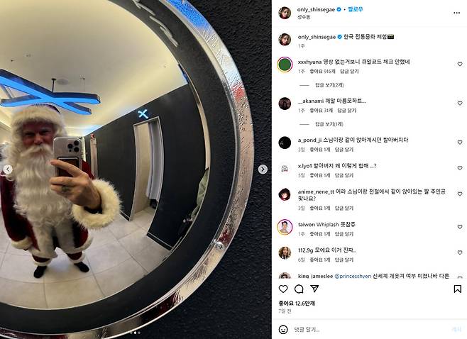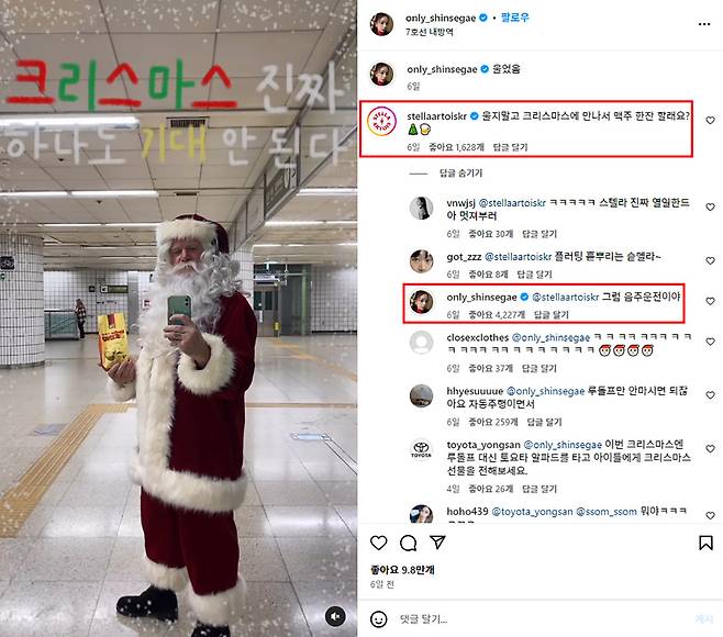 7호선 내방역에서 ‘크리스마스 진짜 하나도 기대 안 된다’며 내방에서 울었다는 걸 표현한 것으로 보여요. 손에 델리만쥬를 들고, 산타룩으로 지하철 거울 셀카를 촬영해요. 스텔라(맥주 브랜드)가 크리스마스에 맥주 한 잔하자며 플러팅하지만, 음주운전이라며 절제력을 보여주죠. 산타의 게시물들에는 이런 재밌는 댓글이 많아요.