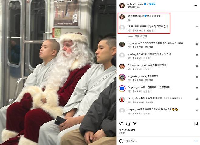 7호선 도봉역의 지하철에서 촬영된 산타는 스님 사이에 껴서 이동해요. ‘모르는 분들임’이라고 하지만, ‘양쪽 털 다뺐어갔네’라는 댓글이 웃음을 자아내요.