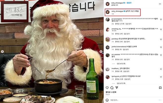 산타는 을지로3가에서 순대국밥과 소주를 한 잔하며, ‘인생 순대국밥 찾음’이라고 싸인까지 남겼는데요. 정작 인스타그램 피드에서는 ‘솔직히 그냥 그랬음’이라며 새침한 모습을 보여요.