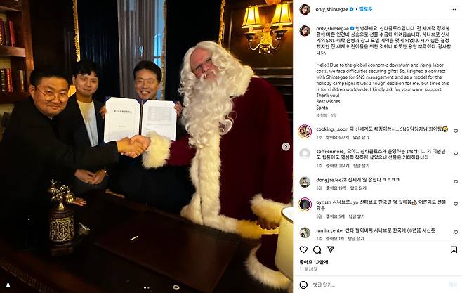산타는 전 세계적 경제불황에 따라 인건비 상승으로 선물 수급이 어렵다며 신세계의 SNS 위탁 운영과 광고 모델 계약을 맺게 됐다고 전하는데요. 크리스마스에 어린이들에게 선물을 주는 산타클로스가 크리스마스 약 한 달 전, 신세계의 SNS에 등장한 거죠. 어린이들을 위한 것이라며 따뜻한 응원도 부탁했고요.