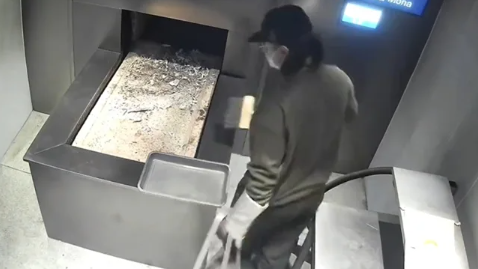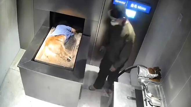 영상 속에서, 반려견은 마지막으로 옷을 입고 차가운 기계 위에 놓여졌다. 작업자는 반려견을 화장 기계에 넣은 후, 약 1시간이 지난 후 남은 뼛가루를 정리했다.