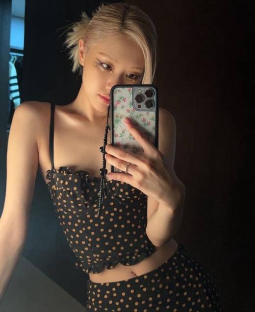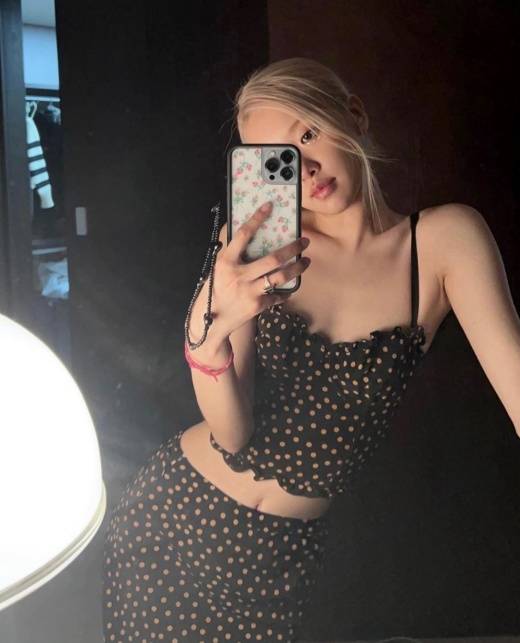 로제는 크롭톱에 치마를 입어 늘씬한 몸매를 자랑했다. 금발 헤어스타일과 화려한 메이크업이 신비로운 분위기를 자아낸다. 카리스마와 러블리가 공존하는 비주얼이 인상적이다.