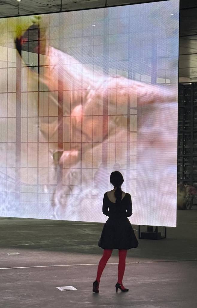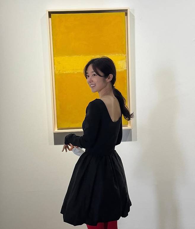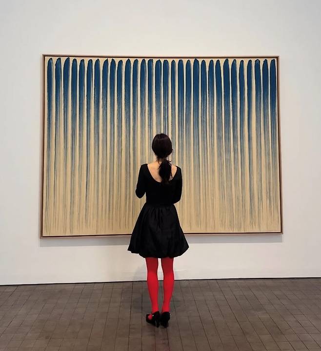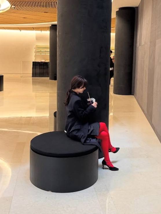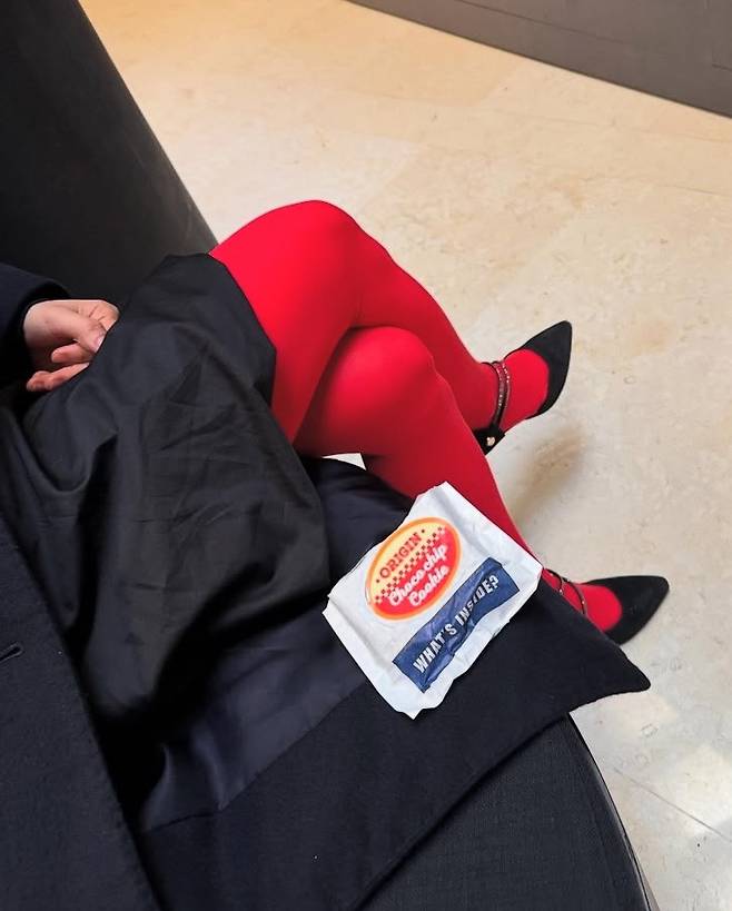허리선이 강조된 A라인 실루엣은 페미닌 한 무드를 강조했으며, 대비되는 강렬한 레드 타이츠 매치는 과감한 컬러 포인트로 패션 센스를 드러냈습니다.