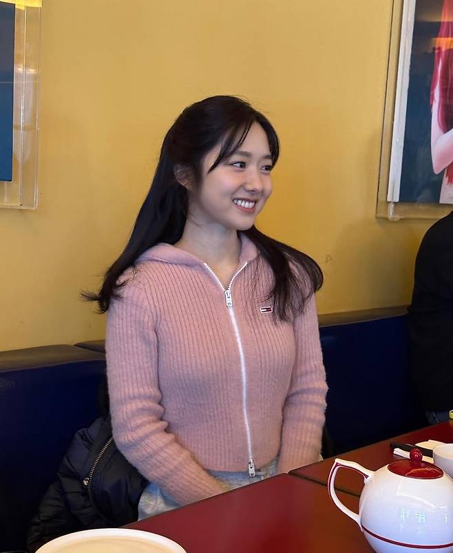 파스텔 핑크 컬러의 니트 후디는 포근하고 사랑스러운 인상을 주었고, 몸에 맞게 핏 되는 실루엣으로 건강하고 발랄한 에너지를 표현했습니다.
