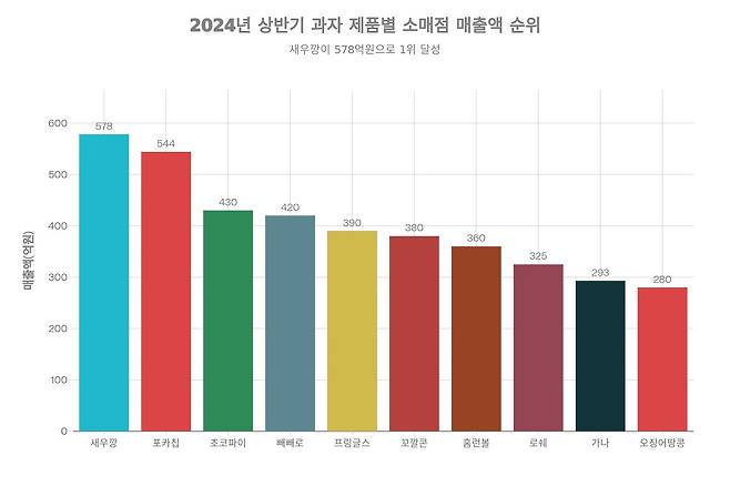 한국의 과자 시장에서 절대강자의 지위를 유지하고 있는 제품이 있다. 올해 상반기 소매점 매출 기준으로 농심의 '새우깡'이 578억 원이라는 높은 매출액을 기록하며 전체 과자 카테고리에서 1위를 차지했다. 이는 스낵, 반생초코케익, 초콜릿, 비스킷 등 모든 과자 분류를 포함한 종합 순위에서 새우깡이 얼마나 강한 입지를 가지고 있는지를 명확히 보여준다.