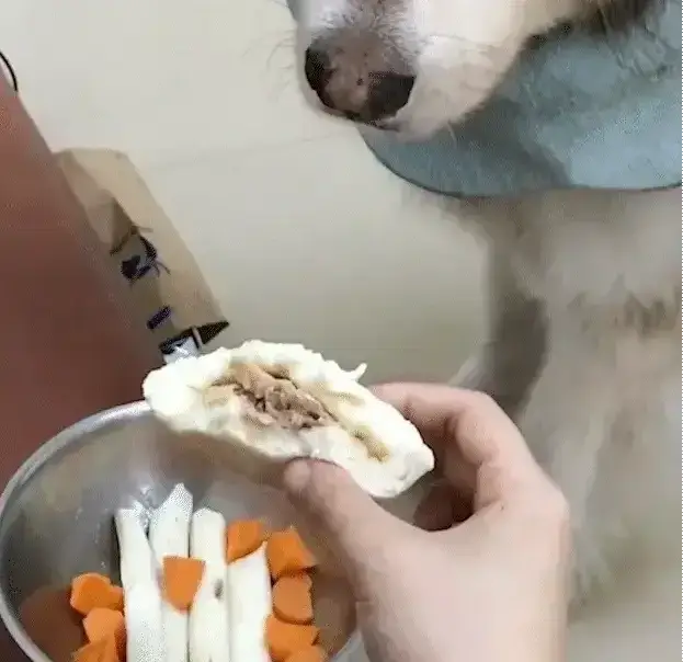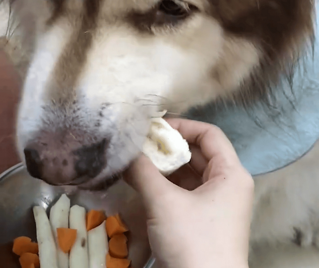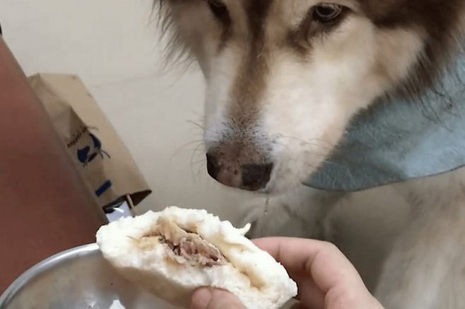 결국 주인이 진심으로 음식을 거두려 하지 않는다는 것을 확인한 강아지는 그제야 안도의 숨을 내쉬며 만두를 조심스럽게 집어 들었습니다. 그리고는 허겁지겁 맛있게 만두를 먹기 시작했습니다.