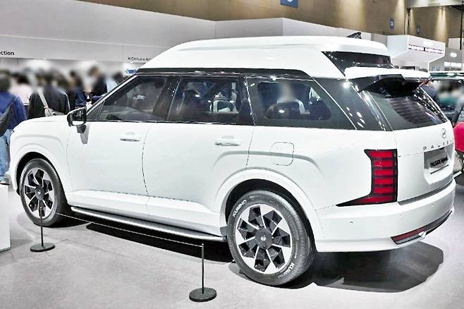 우선 완성형 차량이 아닌 듯 실내에 탑승할 수 있도록 문을 개방하진 않았지만, 살펴볼 수 있는 면모는 충분히 있었다. 실외부터 간단히 훑으면, 얼핏 봐서는 모를 정도로 자연스럽게 디자인된 하이루프는 기존 하이리무진 등 특장 모델에서 느낄 수 있는 소위 초밥 같은 디자인과는 궤를 달리한다. 아울러 새롭게 디자인한 것으로 보이는 20인치 휠은 기존 팰리세이드에 적용된 다중 스포크 디자인과 다르게 두터운 디자인을 자랑하기에 이미지도 달라진다.