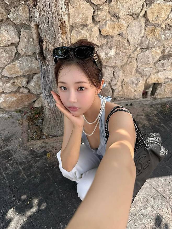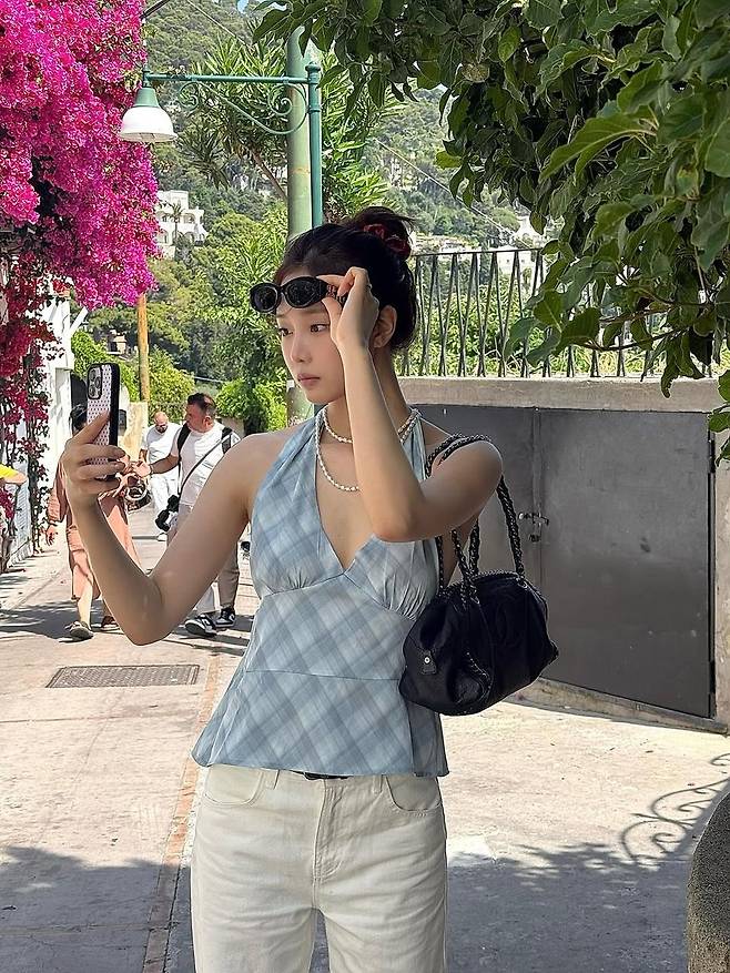 블라우스의 시원한 블루톤 체크 패턴은 고전적인 감성과 함께 여름의 청량함을 전달하며, 데님 팬츠와의 조화로 자연스러운 데일리룩을 완성했다. 여기에 가녀린 진주 네크리스와 블랙 숄더백을 더해 스타일링에 우아함과 시크함을 동시에 담아냈다. 특히 이시안은 선글라스를 머리 위에 올리는 등 센스 있는 포즈로 여름 여행의 경쾌한 분위기를 살렸다.