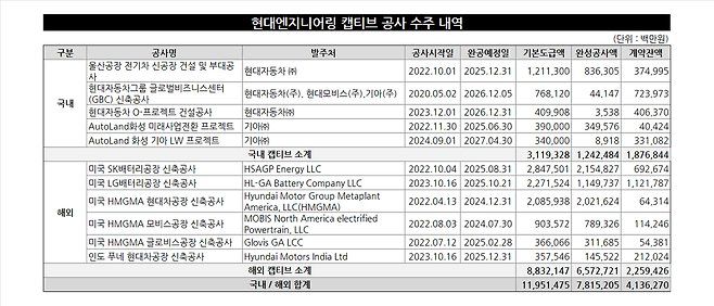 현대차그룹에서 현대엔지니어링에 공사를 발주한 계열사는 현대자동차, 현대모비스, 기아 등 3곳이다. 미국 공장 신축과 관련한 현대차의 공사 발주 규모가 가장 크다. 친환경·미래 모빌리티 관련 인프라 구축을 위한 그룹 차원의 투자가 늘면서 관련 공사 수주가 증가했다.